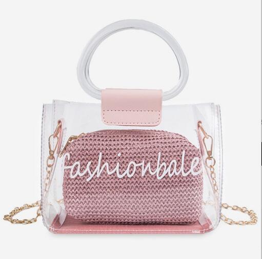 tote bag featuring fashionable text, faux leather trim, dual top clear handle, a smaller woven straw bag with top zip closure, high polish hardware, a removable chain shoulder strap. Can be worn as a crossbody bag or a tote bag.